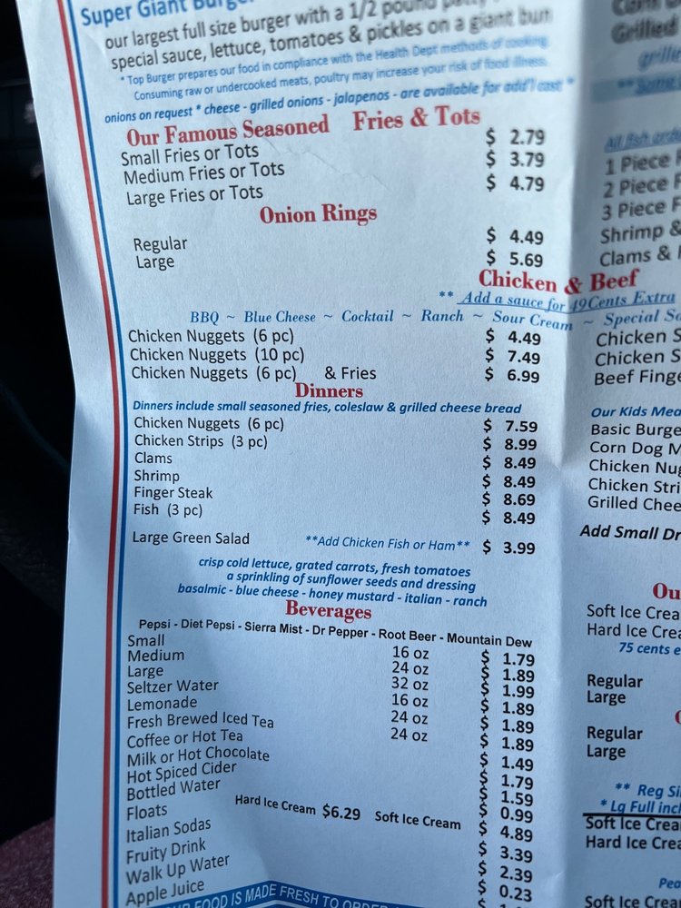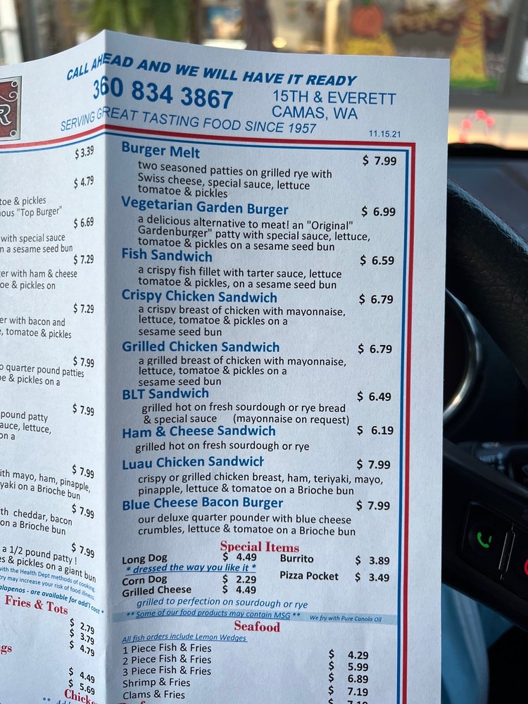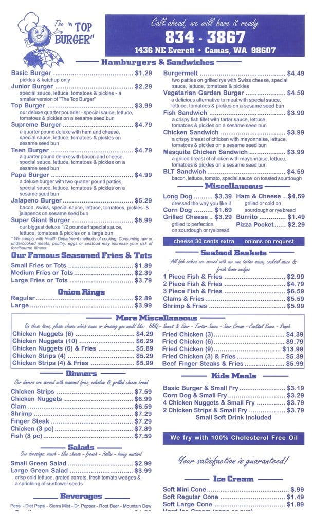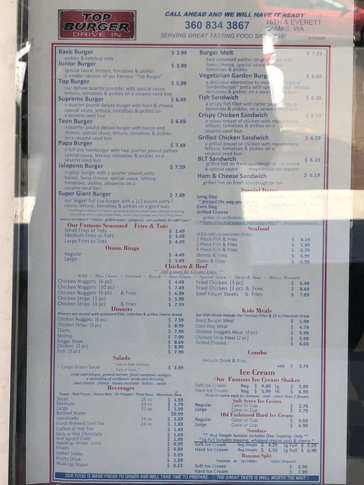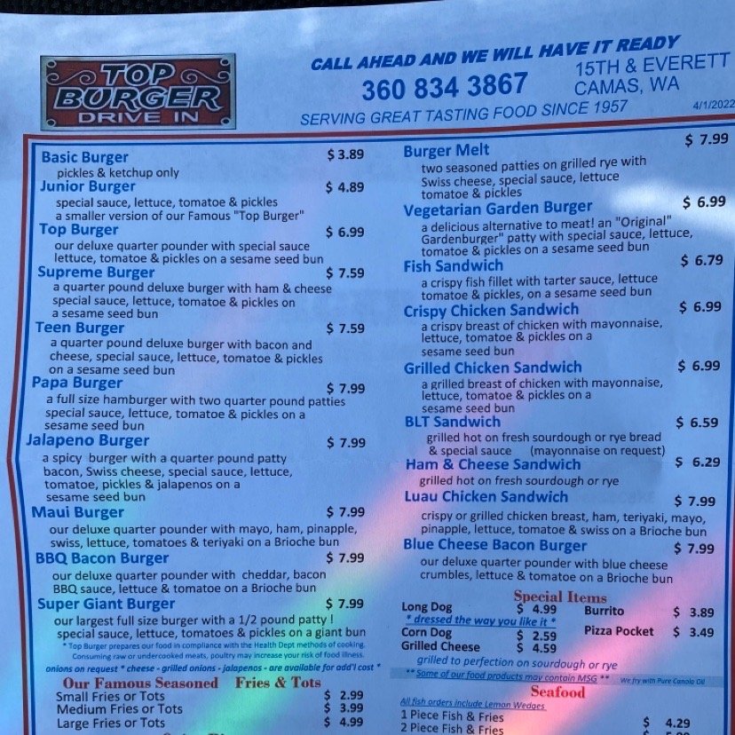 Top Burger, located in Camas, WA, offers a classic American burger experience with a 1950s style decor. Customers rave about the amazing service and tasty food, with options for vegetarians as well. The owner is praised for being caring towards both guests and employees. Reviews highlight the delicious jalapeño burgers, ice cream, and customizable menu choices. The drive-thru, outdoor seating, and friendly staff add to the welcoming atmosphere. Top Burger stands out for cooking everything to order, setting it apart from fast-food chains. The menu offers a variety of sides, cheeses, and toppings, making each visit a unique and satisfying experience. Whether you're looking for a quick bite or a leisurely meal, Top Burger's nostalgic charm and quality food make it a top choice for a summer stop or casual dining.